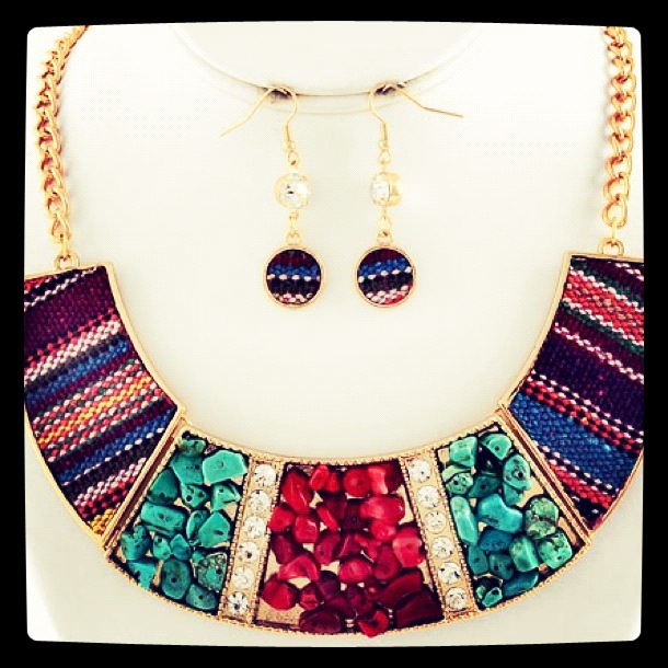 Gold Tone / Red & Turquoise Stone / Multi Color Fabric / Lead Compliant / Necklace & Fish hook earring set • Length : 19" + EXT • Earring : 1 1/2" L