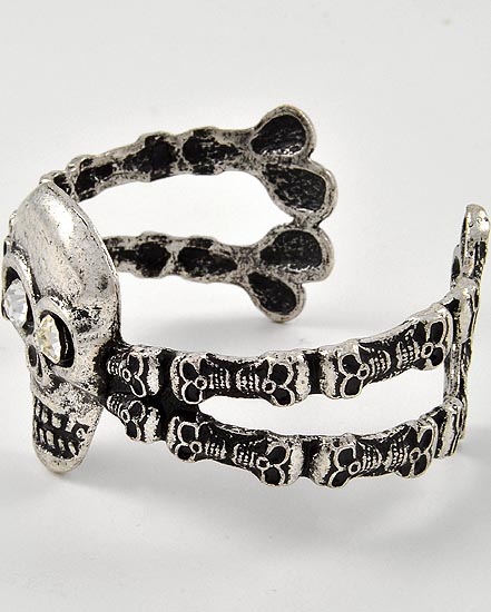 Burnished Silver Tone Metal / Clear Rhinestone / Halloween Skull Design / Cuff Bracelet • Size Free : CUFF • Diameter : 2 1/2" • Width : 1 3/8"