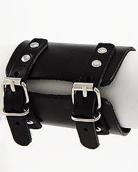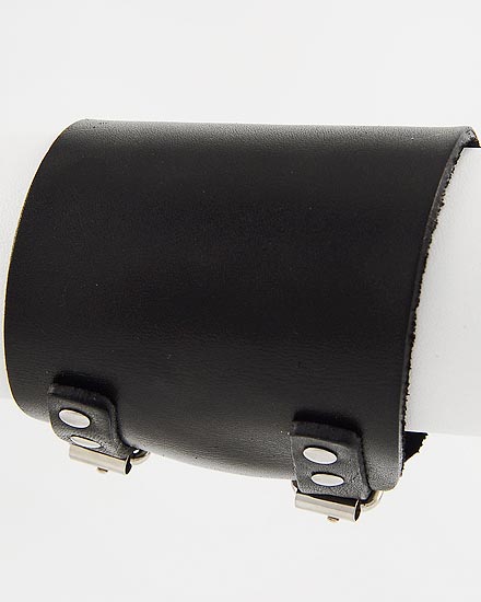 Rhodiumized / Black Leather / Buckle Closure / Band Bracelet • Length : 7 1/4" - 8 3/4" • Width : 3"