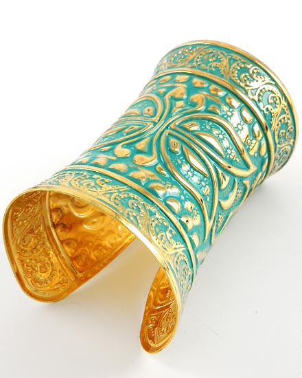 Gold Tone Metal / Patina Finish / Bracer Design / Cuff Bracelet • Size Free : CUFF • Width : 3 7/8"