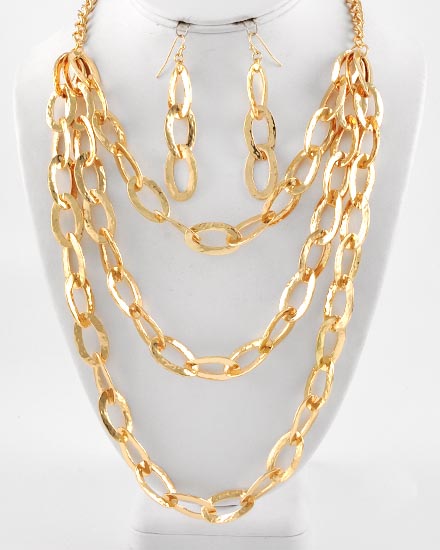Gold Tone / Lead Compliant Metal / Multi Row Metal Link Chain Necklace & Fish Hook Earring Set