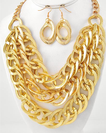 Gold Tone / Textured Metal Link / Multi Row Necklace & Fish Hook Earring Set • Length : 18" + EXT • Earring : 2 1/4" L • Drop : 3 1/8" L