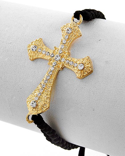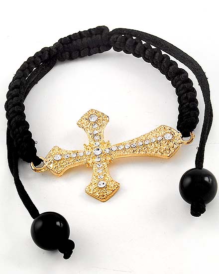 Gold Tone / Black Cord / Clear Rhinestone / Cross Adjustable Bracelet • Size Free : ADJUSTABLE • Top Face : 1 1/4" W X 1 1/8" L