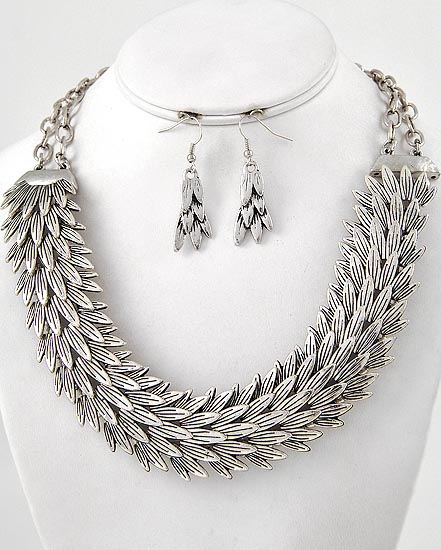 Antique Silver Tone Metal / Lead Compliant / Necklace & Fish Hook Earring Set • Length : 15 1/2" + EXT • Earring : 1 7/8" L • Drop : 1 1/8" L