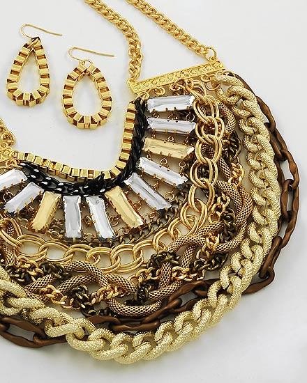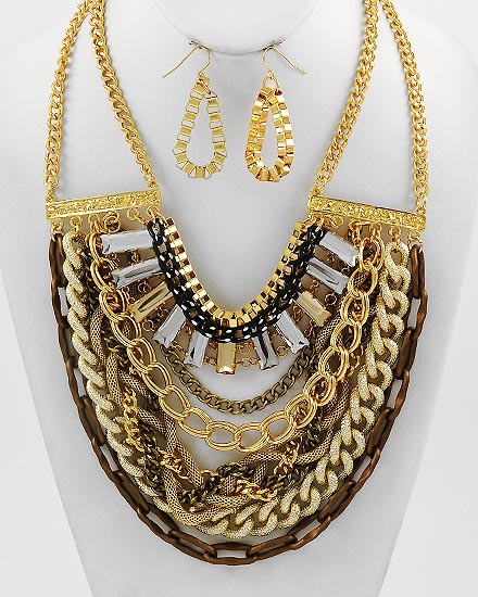 Gold Tri-tone Metal / Clear & Topaz Acrylics / Multi Row Necklace & Fish Hook Earring Set • Length : 18" + EXT • Earring : 2" L • Drop : 5 1/4" L