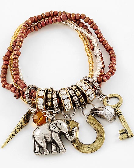 Two-tone / Bronze & Gold Acrylic Beads / Lead Compliant / Assorted Charm / Multi Row Stretch Bracelet • Size Free : STRETCH • Charm : 1 5/8" L