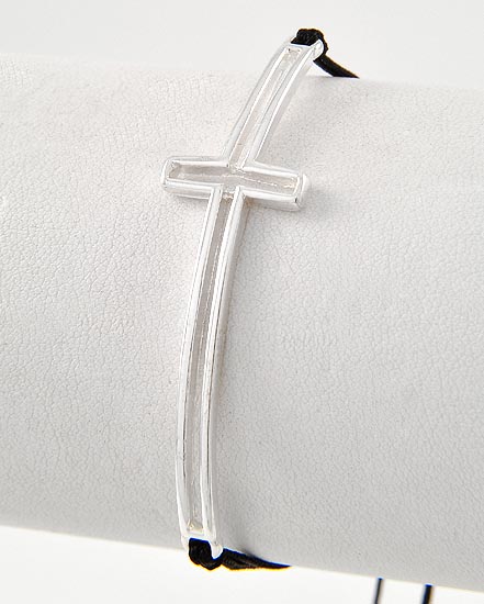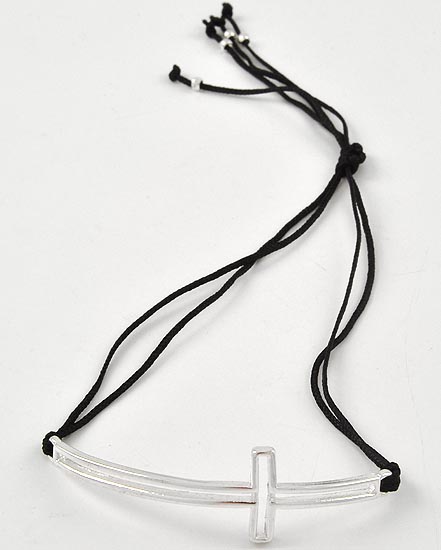 Silver Tone / Black Fabric Cord / Adjustable Cross Bracelet • Size Free : ADJUSTABLE • Charm : 2" W x 5/8" L