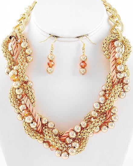 Gold Tone / Peach Fabric / Gold Ccb Beads / Lead Compliant / Multi Strand Necklace & Fish Hook Earring Set