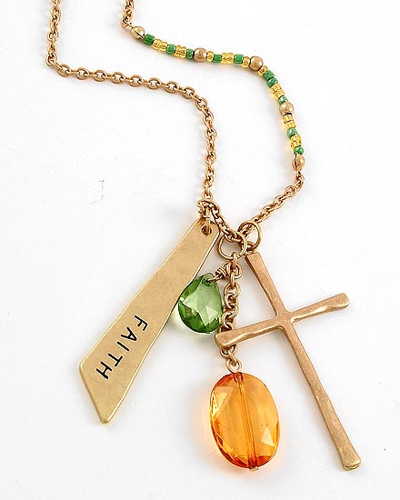 Matte Gold Tone Metal / Topaz Acrylic / Lead Compliant / Long Cross Charm Necklace • Length : 30" + EXT • Charm : 1 1/2" W x 2 1/2" L