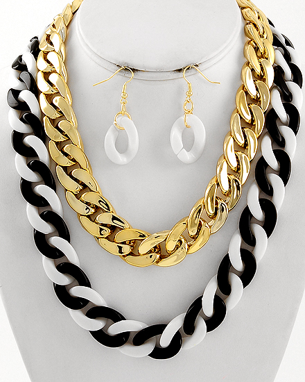 Black-white & Gold Metal Look Acrylic / Lead&nickel Compliant / 2 Row Chain Necklace & Fish Hook Earring Set • Length : 16 1/2" + EXT • Earring : 1 3/4" L • Drop : 2 1/4" L