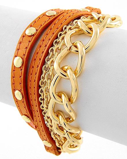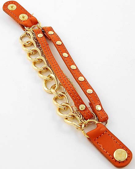 Gold Tone Metal / Orange Leatherette / Lead&nickel Compliant / 2 Size Snap Button Closure / Multi Row Bracelet • Length : 7 1/2" - 8" • Width : 1 1/4"