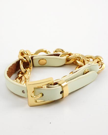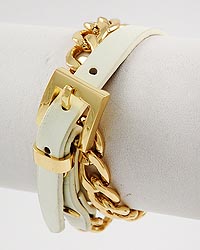 Gold Tone Metal / Ivory Leather / Wrap Style Buckle Closure Bracelet • Length : 14 1/4" - 15 1/4" • Width : 5/8"