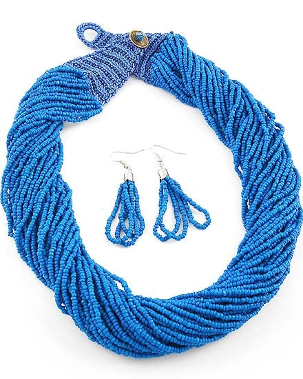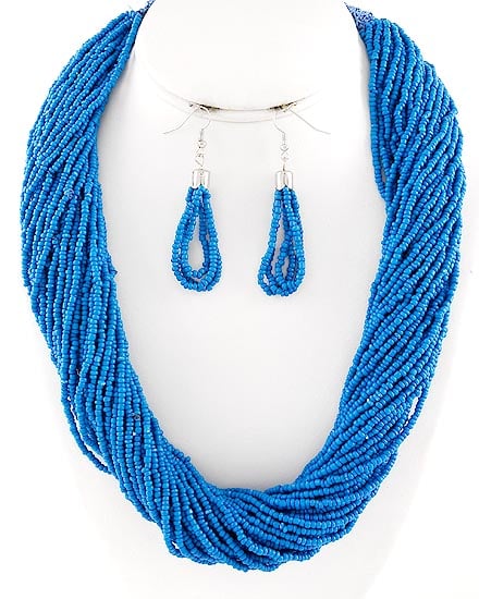 Rhodiumized / Blue Acrylic Seed Beads / Lead Compliant / Multi Strand Necklace & Fish Hook Earring Set